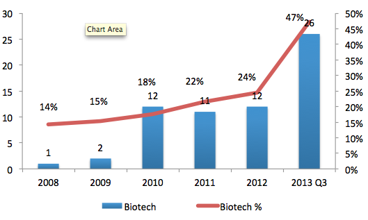 물론 HOT한 것을 피하는 것이 투자의 기본일수도 있다. 다만 한동안 헬스케어 분야의 투자가 급감한 이유는 헬스케어 산업의 회수시장이 막혀있었던 것인데, 회수시장이 열리기 시작한 부분으로 이해한다면, 헬스케어 벤처산업이 가진 가장 큰 문제였던 유동성 리스크가 해소된 것으로 볼수 있다. 2013년도는 지난 2000년도 지노믹 버블 (Genomic Bubble: IT업계에서 닷컴버블기간이라고 불리우는 1999~2000년대를 바이오업계에서는 지노믹 버블이라고 한다) 이후, 바이오텍 IPO 최고의 해로 기록되고 있다. 실제로 2013년 3분기까지 26개 바이오텍 회사가 IPO를 갔으며, 이는 벤처기업 IPO 전체의 47%에 달한다.