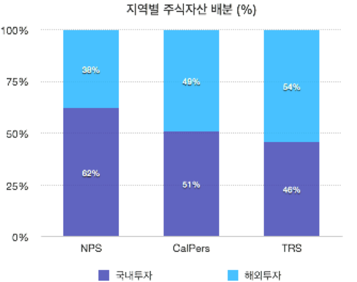 채권은 정확한 비율은 안나오지만, 어차피 수익의 상당부분이 주식형 자산에서 나올 것이고. 국민연금은 엄청난 금액을 한국증시라는 작은 시장에 60% 이상을 붓고 있다. CalPers나 TRS의 경우는 거의 5:5로 미국과 해외로 자산을 배분하고 있다. 참고로 미국주식시장이 전세계주식시장에 차지하는 비중이 약 50%이다.