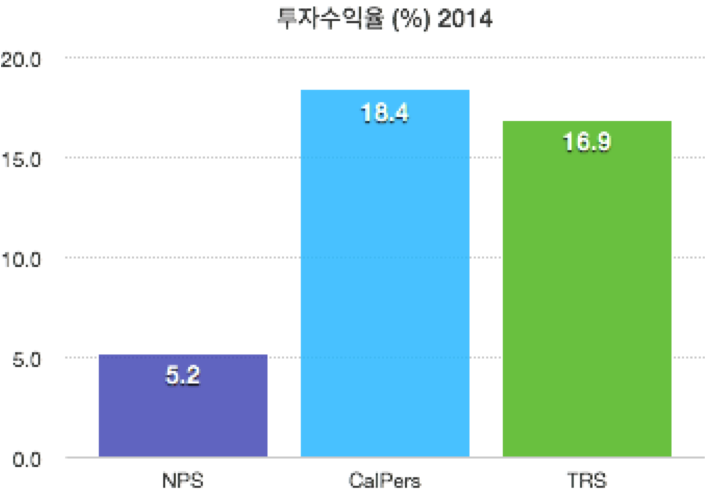 한국의 국민연금과 미국내 가장 큰 연금인 CalPers (300조 운용)와, 그리고 텍사스교원연금 (150조 운용)의 2014 회계년도의 수익율을 비교해보면, 수익율은 거의 1/3 수준이다.